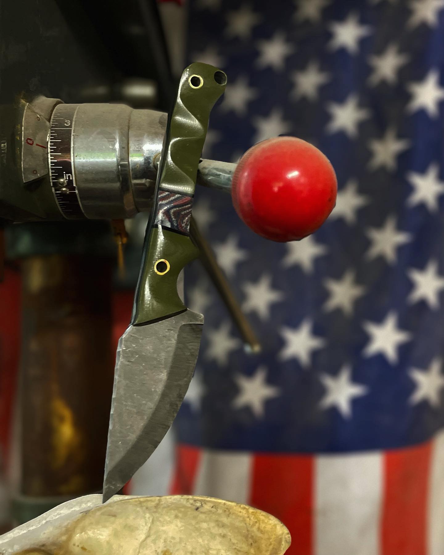 OD green g10, American flag micarta split, brass pins nitro v acid etched steel 7.5 overall length