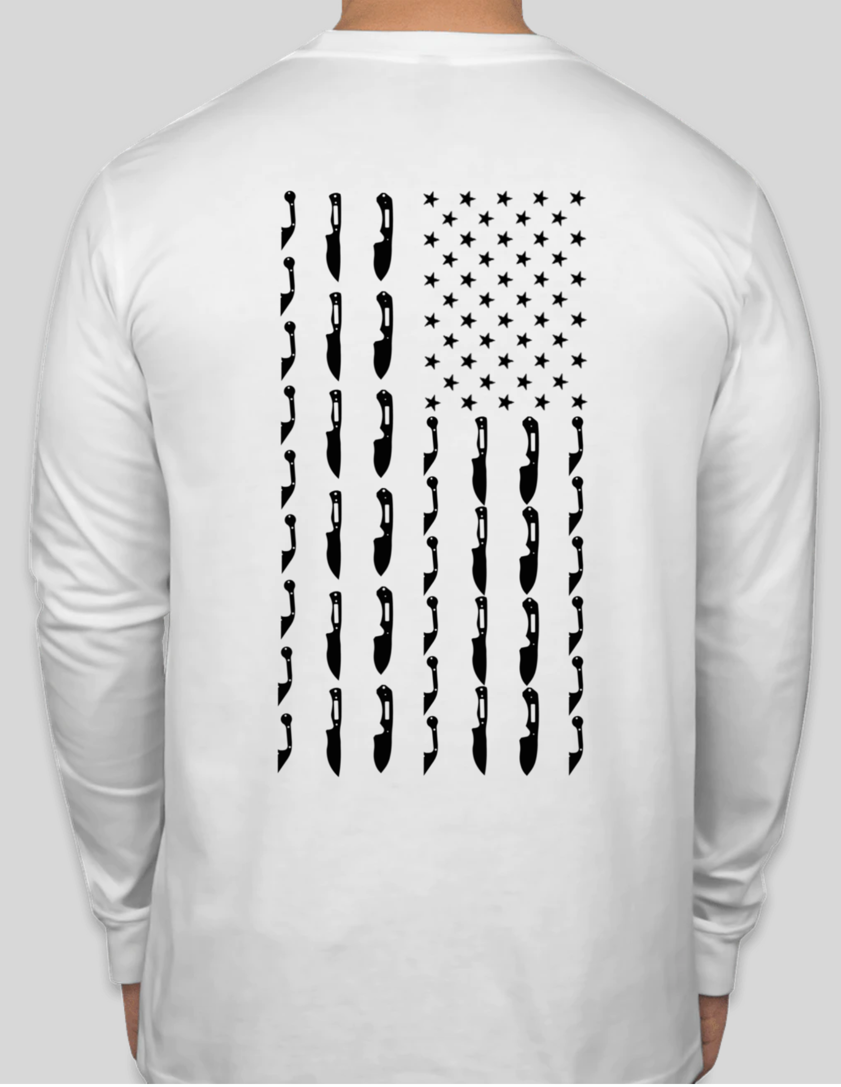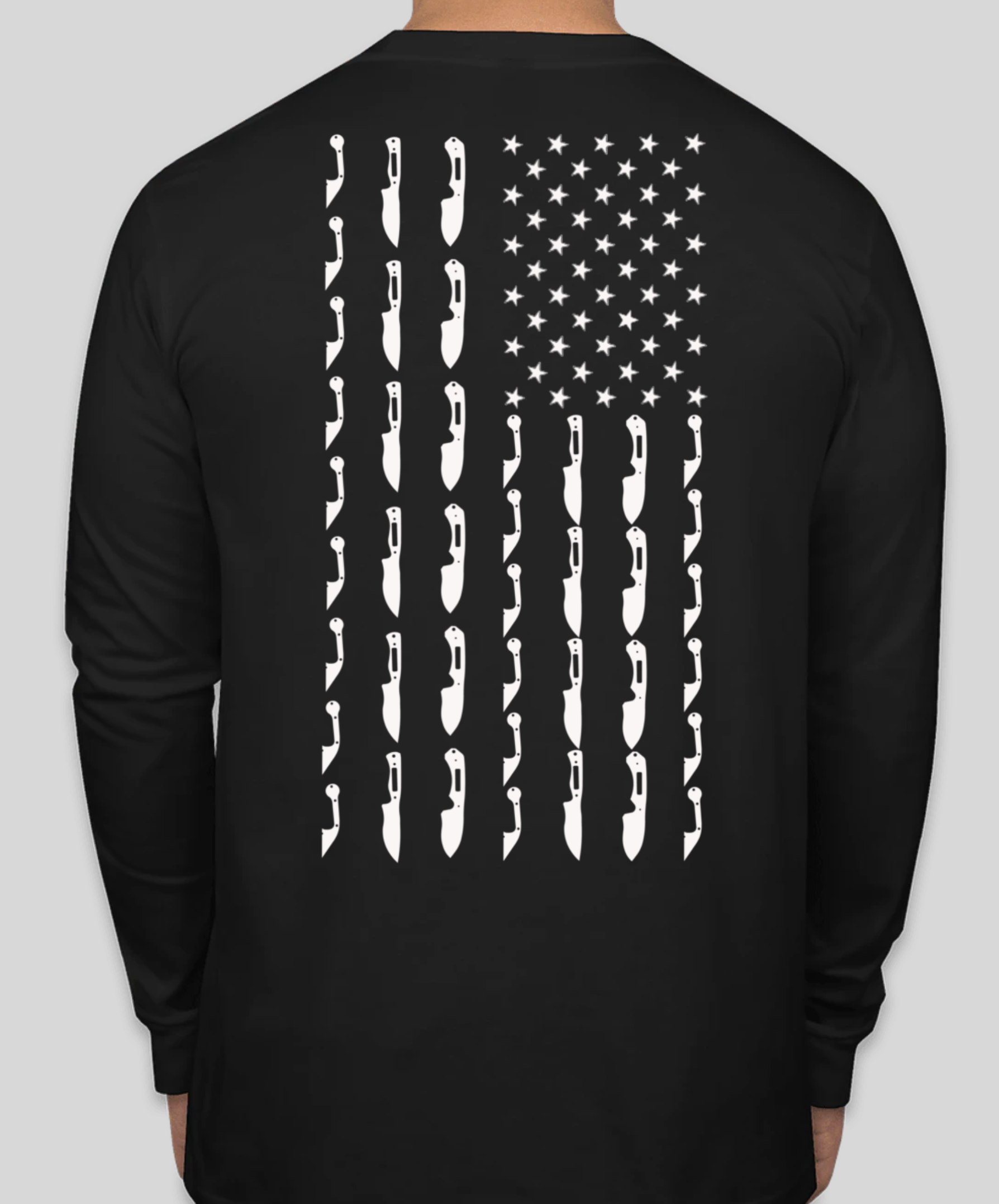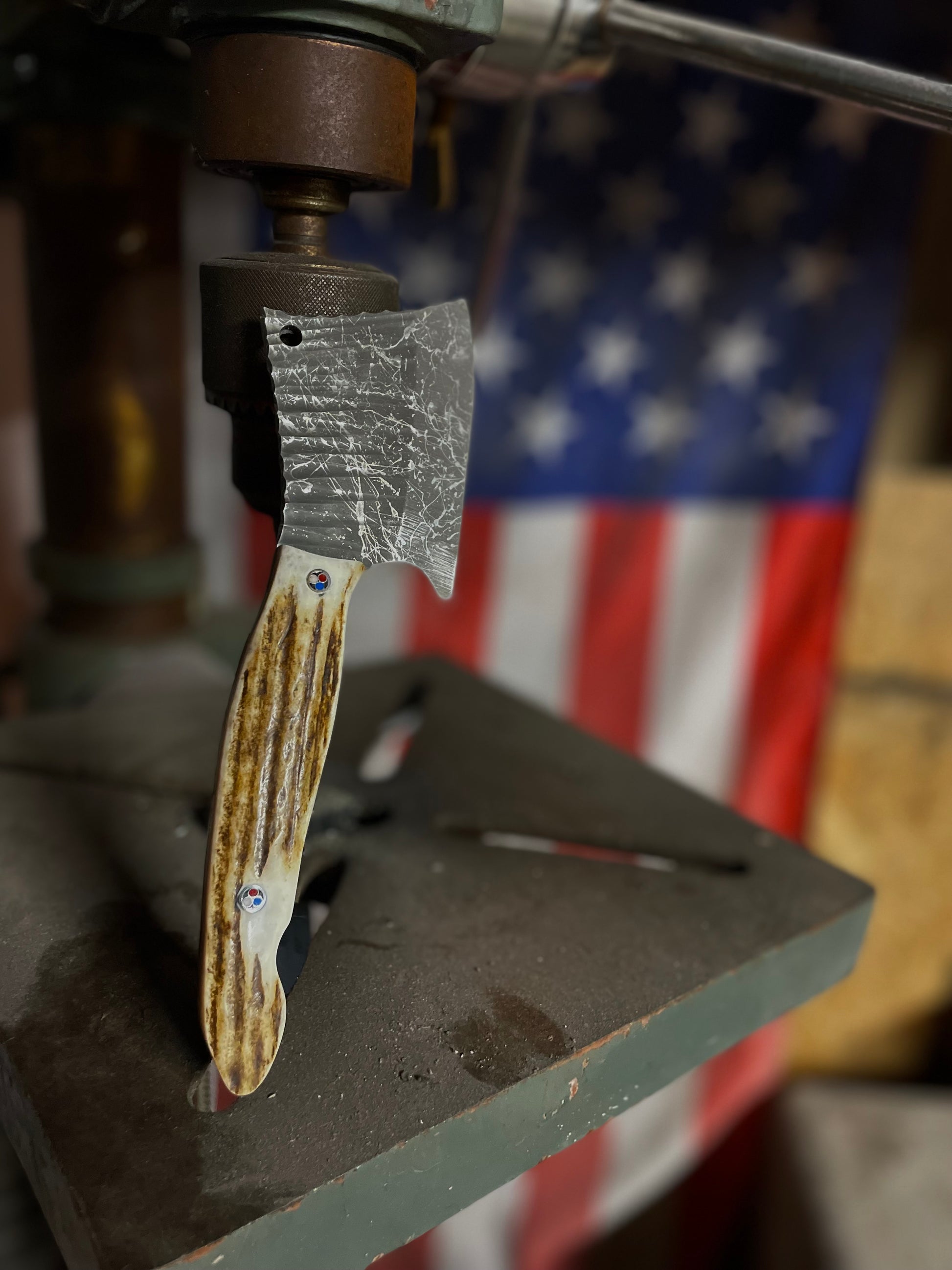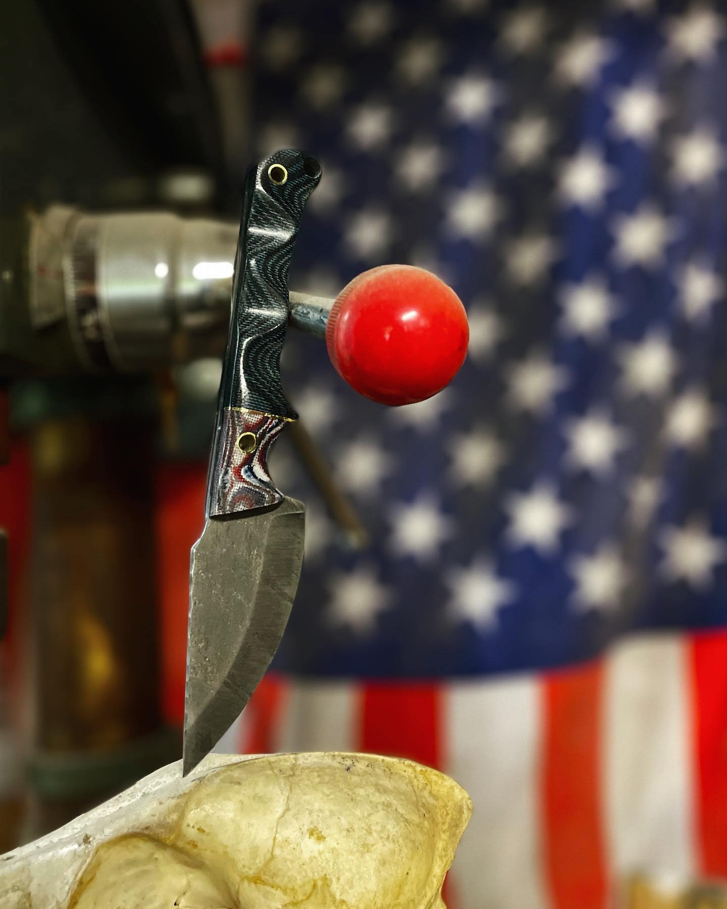 American flag bolster, brass spacer, brass hollow pins, blue Jean micarta, nitro v acid etched steel 7.5 overall length
