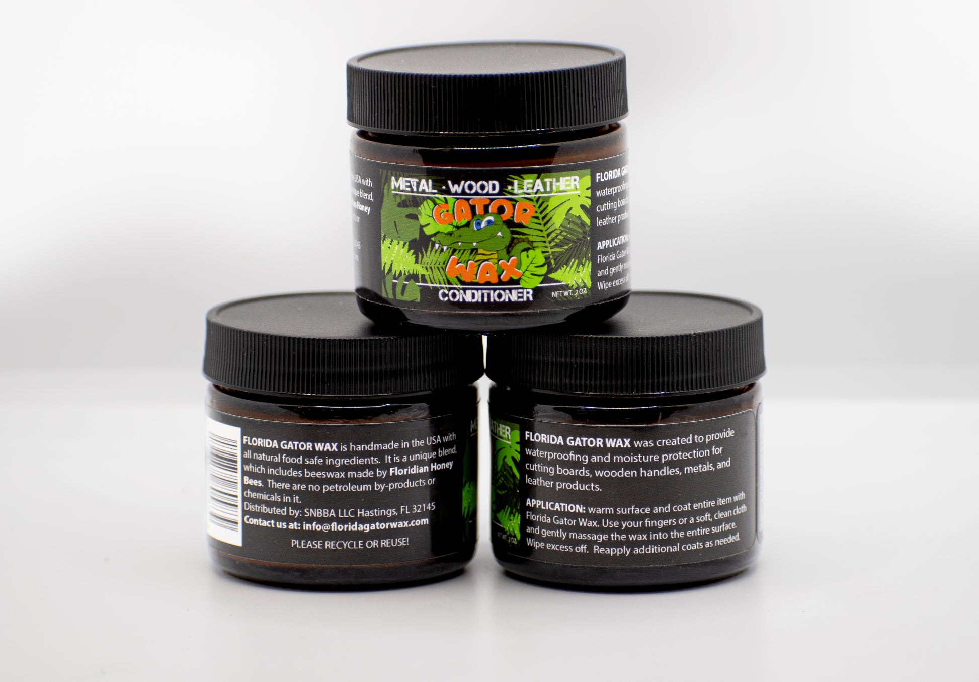 What is Florida Gator Wax? Florida Gator Wax was created to provide water proofing and moisture protection to a variety of products, from wood and leather, to metal. It is handmade in the USA with all natural food safe ingredients, including beeswax from Floridian Honey Bees. There are no petroleum by-products or chemicals in it.